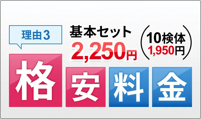 おすすめ検査項目 基本セット+サルモネラ 所要日数 3日間 金額 3,500円 -