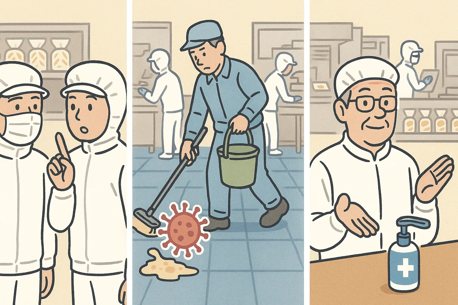 食品工場で最も恐れられるのがノロウイルスの持ち込みと拡散。本記事では、従業員の健康管理や入場ルールの再点検ポイントを、実例やクイズを交えつつわかりやすく解説。工場責任者・品質管理担当者必読の完全マニュアルです。