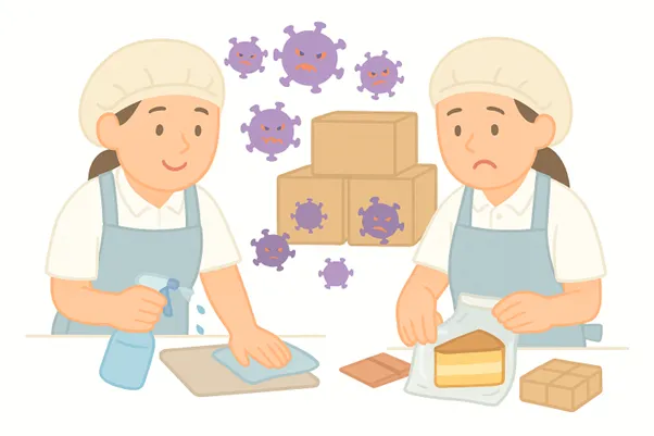 この工程で、室温放置・手袋交換忘れ・作業台の汚染といったリスクが重なりやすくなります。再包装は“第二の製造工程”と捉え、同等の衛生管理が必要です。