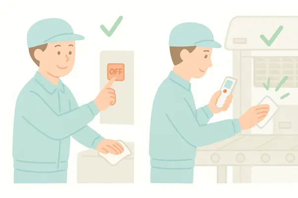 長期休暇明けは、習慣がリセットされがち。そのため、手洗い30秒、衣類の払落とし→作業衣類の粘着ローラー掛け、マスクの正しい着用、ロッカー〜製造室の動線ルールこれらを再度周知することで事故の9割が防げます。