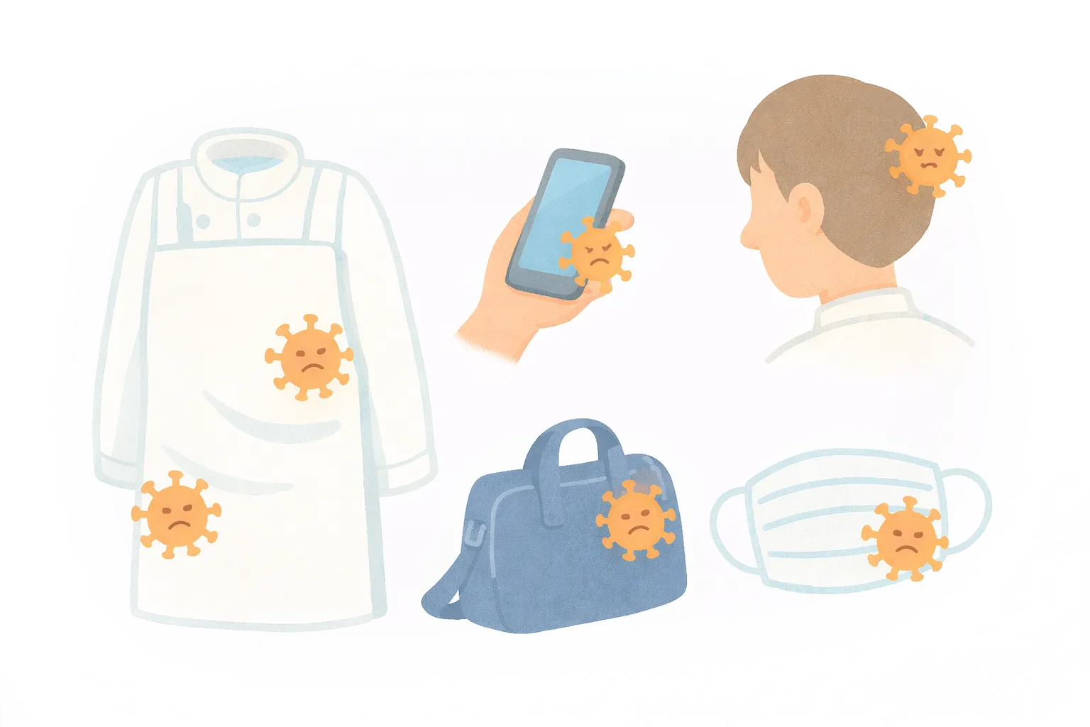 など、あらゆる場所に付着しています。手を洗っても、汚れたエプロンで作業すれば意味がありません。