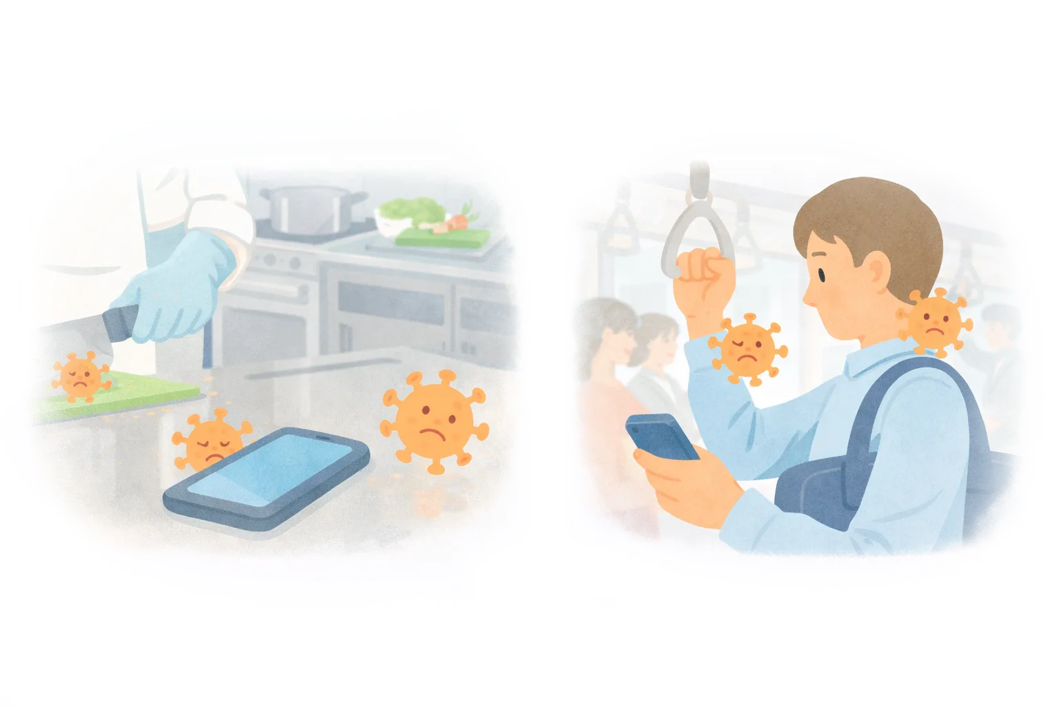 スマホはトイレ・通勤・休憩中にも触れるため、最も汚染されやすい物品です。
