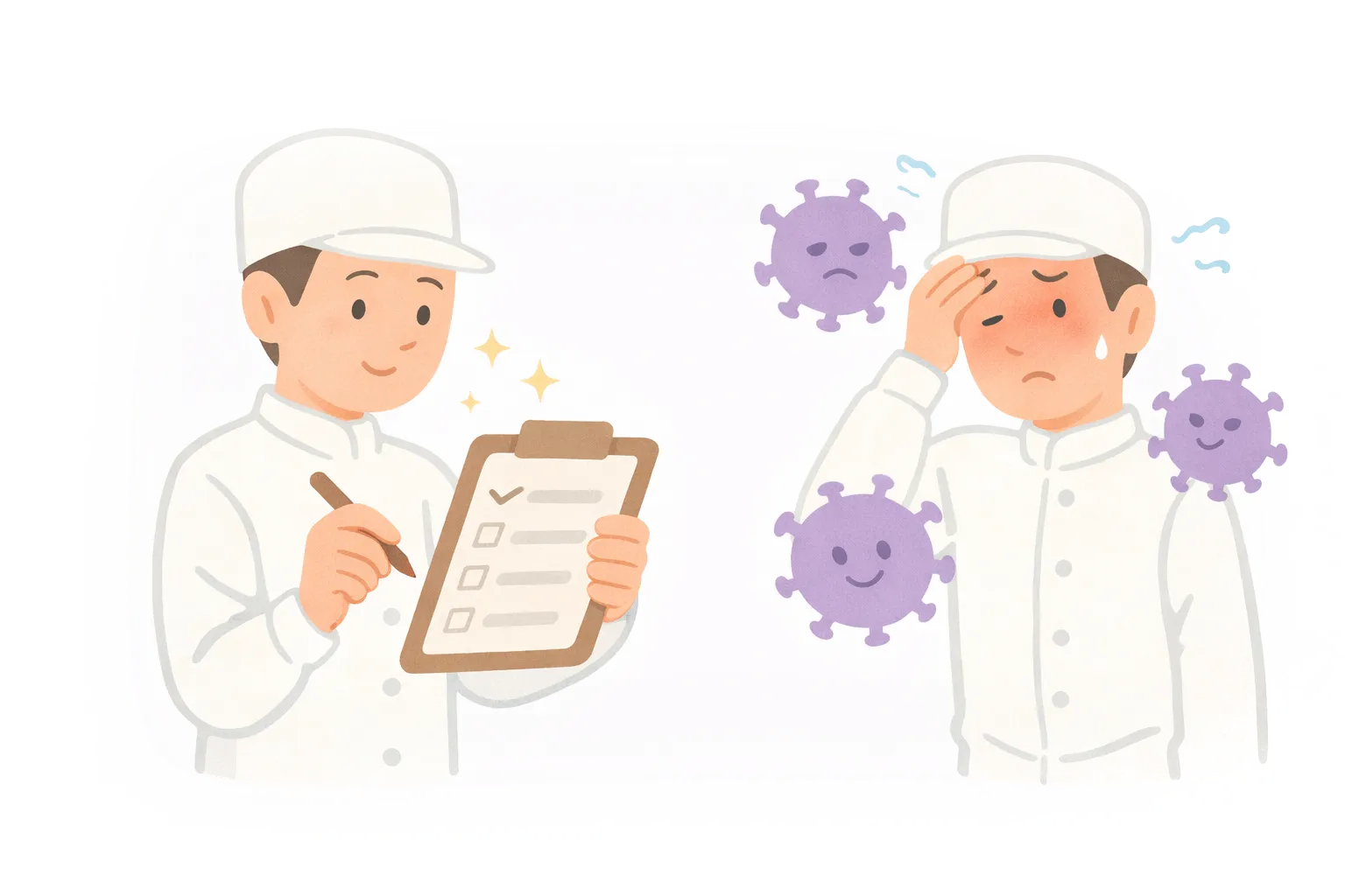 食中毒菌やウイルスの中には、症状が出ていなくても体内に存在し、排出されるものがあります。ノロウイルスはその代表例で、本人が元気でも周囲に菌を広げてしまう可能性があります。見た目や自己判断だけで安全と決めつけず、「症状がない=安全ではない」という前提で管理することが重要です。