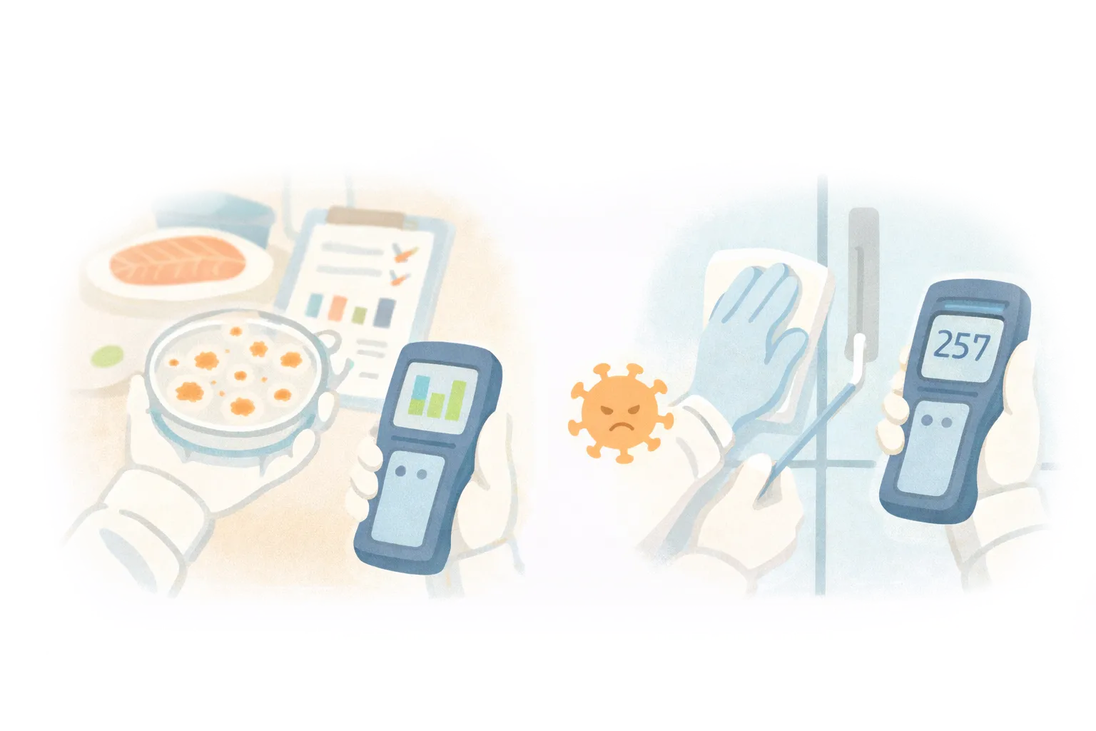 またATPふきとり検査の導入は、現場で洗浄後などの残渣(汚れ)を数値(RLU値)で客観的に評価でき、しかも短時間で確認できるメリットがあります。